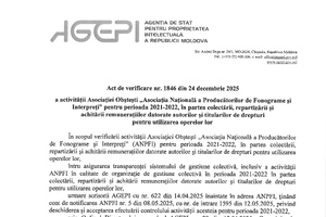 ANPFI publică Actul de verificare nr. 1846 din 24.12.2025 în partea activității Asociației Obștești „Asociația Națională a Producătorilor de Fonograme și Interpreți” pentru perioada 2021-2022 întocmit de AGEPI.